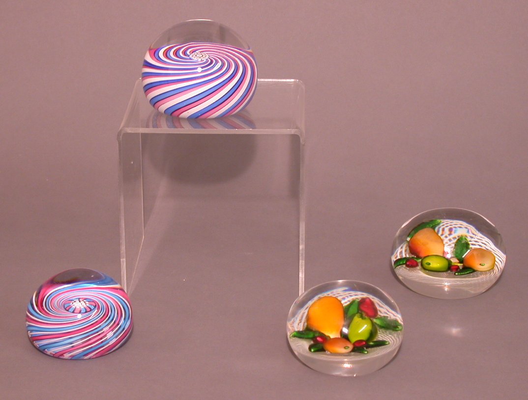 with swirling blue pink and white canes around small central brightly coloured cane, the underside inscribed with a P and dated 1980, 8 cm diameter,another smaller similar paperweight, the base inscribed JD 2001, 7 cm diameter, a paperwight with fruit decoration and white garland canes,another very similar smaller