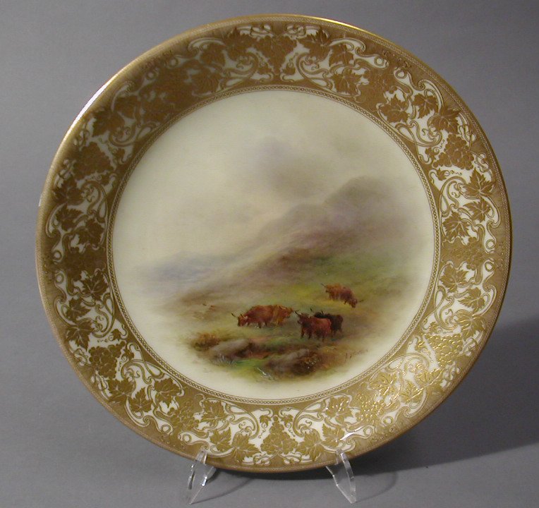 with gilt grape decorated deep border, central roundel painted with six Highland cattle on a misty hillside, signed H. Stinton, printed mark and star and dot code for 1920