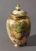 the cover with pointed finial and pierced frieze, the body with pierced pendants, painted with apples, bramble and grapes opposed by two cherries, signed H Henry, black printed mark, post 1959