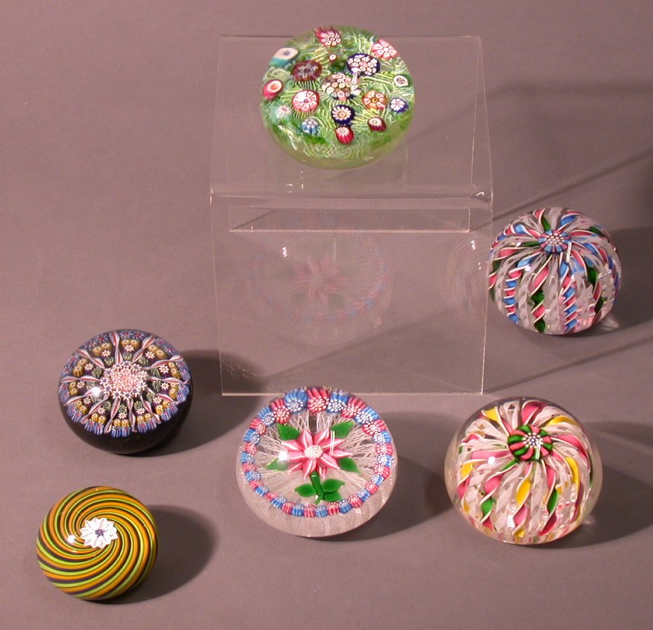 three by JD,two 2000 amd one 2001,one having central pine and white flower with concentric band of pink and blue canes, 7.5 cm diameter,two with alternate spiral twist and white canes,three Perthshire paperweigts one with Inscribed P and two with labels one Paul Ysart