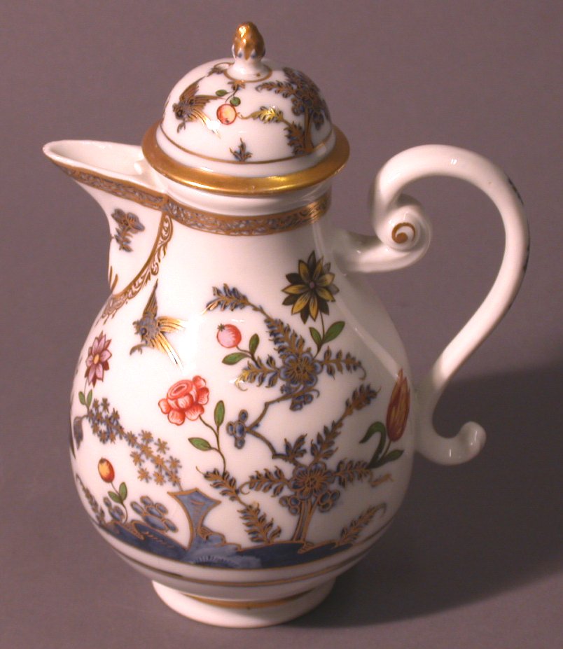 the domed lid with gilt line border and gilt knop finial,over body with applied scroll handle, short angular spout,painted in underglaze blue and rust, puce, yellow, green and gilt with a seated sylvan piper,flanked by branches with fruit flowers and two birds in flight,blue crossed sword mark, 19th century (2)