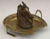 the upper part of the head lifting to reveal well, on a brass dish framed by a horseshoe with stirrup stands