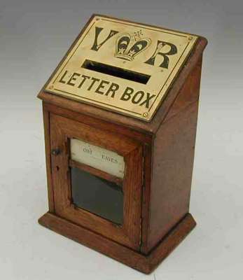 the sloping lid with brass framed aperture inscribed VR LETTERBOX, glazed door to front