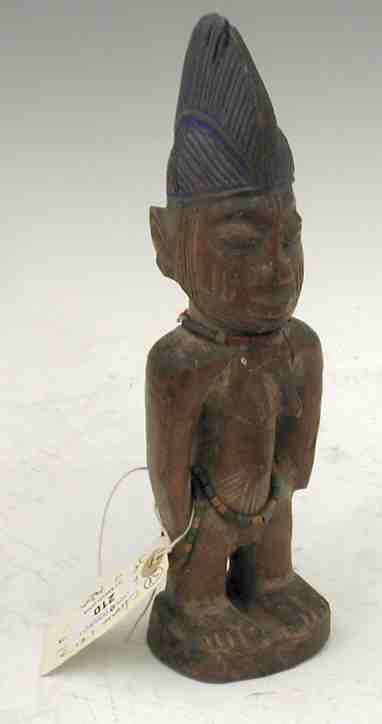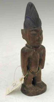 standing on a circular base, decorated with beads around the waist and neck, some blue staining