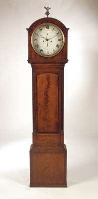 the twin train movement with anchor escapement striking on a bell, enamelled circular dial with Roman chapters, subsidiary seconds and date dials, the arched hood and arched trunk door with shaped boxwood stringing flanked by fluted quarter columns, crossbanded base with plinth