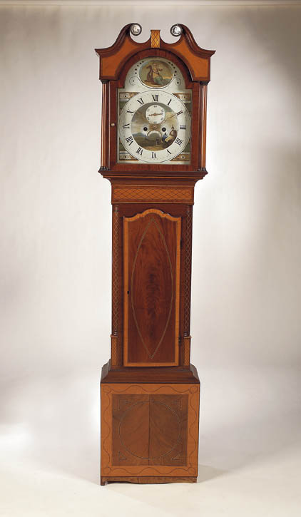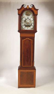 the twin train movement with anchor escapement striking on a bell, the false plate inscribed WALKER & FINEMORE, BIRMINGHAM, the arched dial painted in the neo-Classical manner with a military encampment scene and to the arch with a lady holding a brazier by a camel, with subsidiary seconds dial and date aperture, the case elaborately decorated with satinwood panels and crossbanding and with ebony and boxwood stringing, the hood with swan neck pediment above turned columns, the shaped trunk door flanked by quarter column, the base with bracket feet