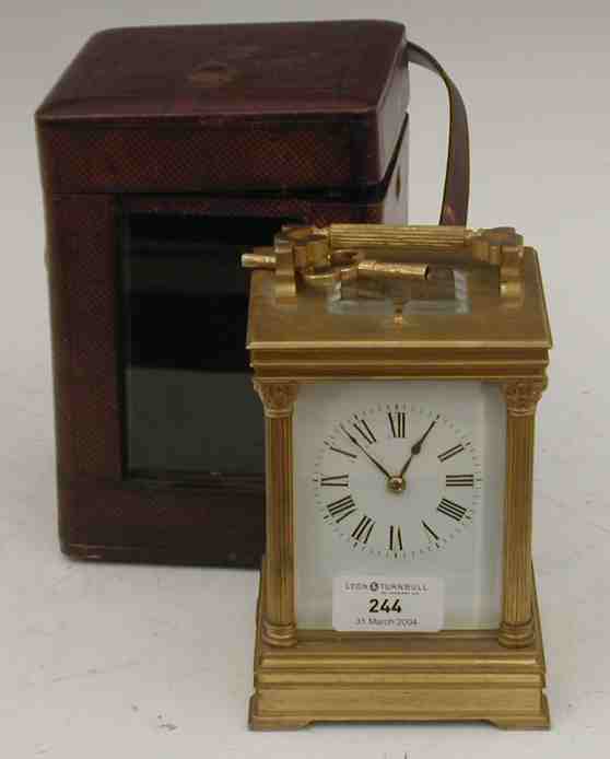 the twin train movement with lever platform escapement striking on a gong, plain enamelled dial with Roman chapters, the case with Corinthian columns at the corners, cornice and plinth; in Morocco leather case