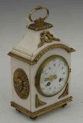 the twin train movement with circular enamelled dial having Roman chapters within rectangular case with caddy top, the whole embellished with giltmetal mounts