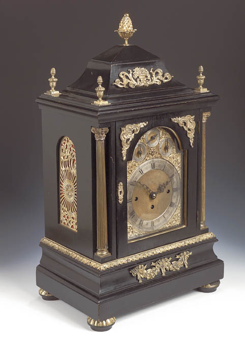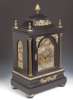 the triple train movement striking Eight bells and Westminster chimes on bells and a gong, the brass dial with silvered Roman chapter ring and subsidiary slow/fast, chime/silent and tune dials, cast spandrels, the case with gilt brass mounts, pagoda top, acorn and urn finials, fluted Corinthian columns to the angles, plinth base with lobed brass feet; on corresponding bracket (2)