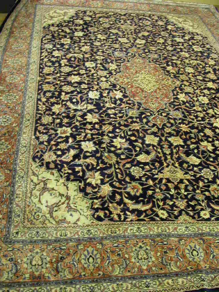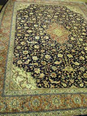 the indigo field with central rust red medallion suspending pendants, eau de nil spandrels, within rust red scrolling vine and palmette border between various bands