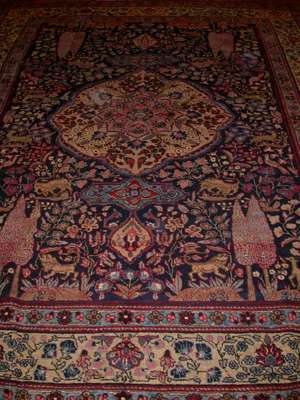 the indigo field with central medallion suspending pendants, trees to the corners, within lemon scrolling foliate vine border between similar blue bands