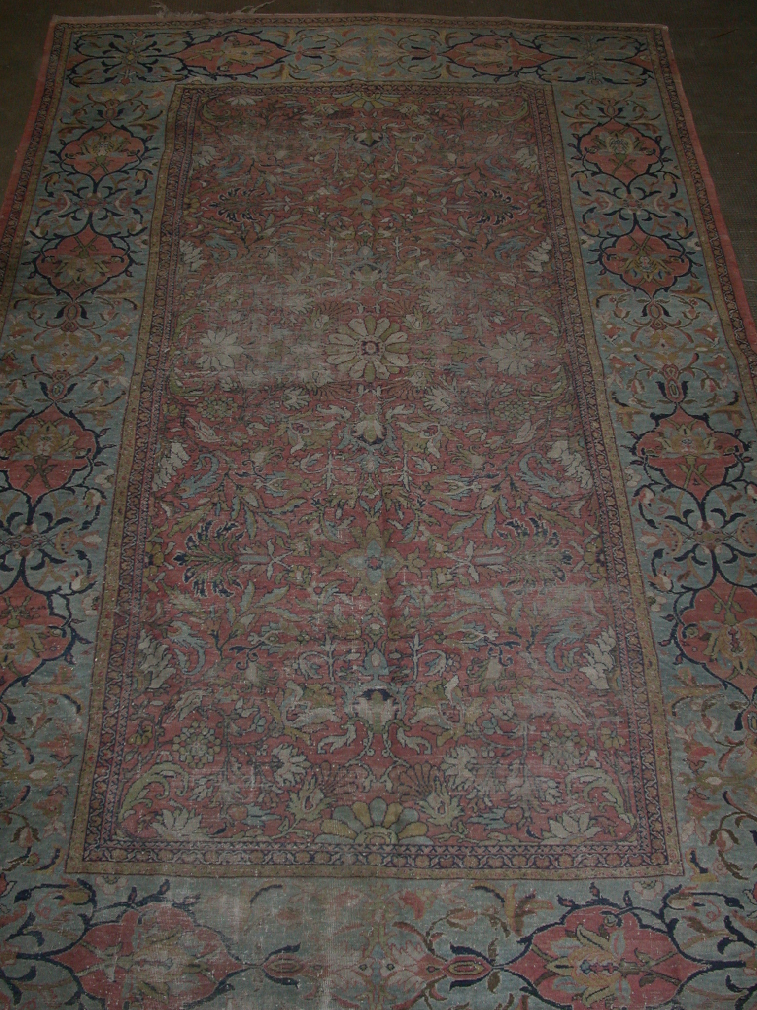 the rust field with small flowerhead medallion and overall pattern of palmettes, within blue cartouche and scrolling vine border between various guard bands