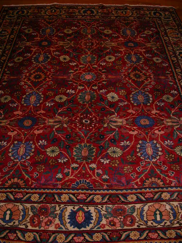 the red field with allover pattern of scrolling vine, palmettes and flowerheads, within cream palmette and floral border between similar bands