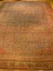 the green field with allover herati pattern, brick red spandrels, within olive palmette border between red and ivory scrolling bands
