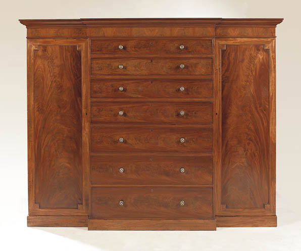 the stepped cornice above seven graduated drawers flanked by panelled cuboard enclosing shelves and hanging space, on plinth base