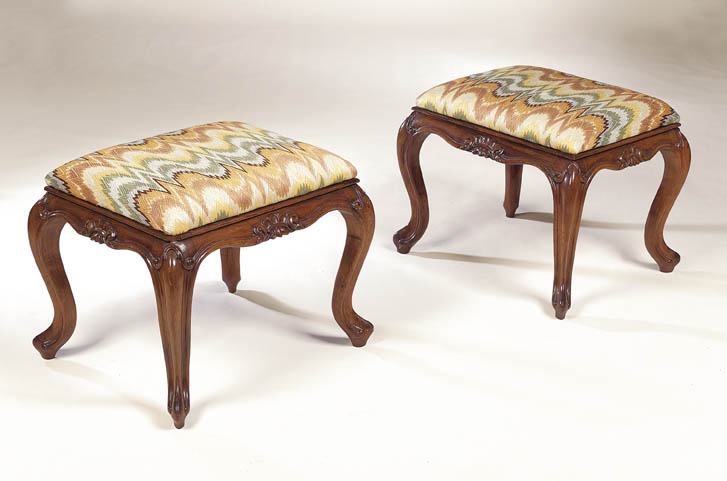 each with rectangular flamework squab above moulded curvilinear apron and legs with scroll toes (2)