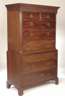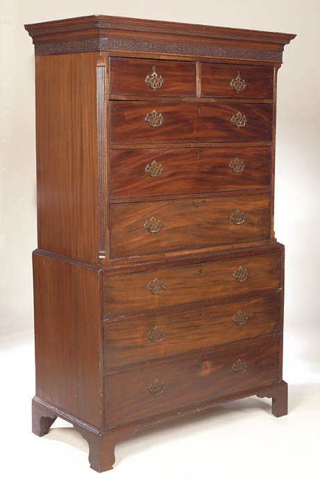 the dentilled cornice with blind fret frieze above two short and three long graduated drawers flanked by fluted angles, raised on base with threee long graduated drawers and shaped bracket feet