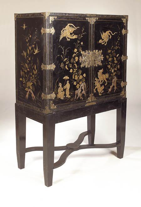 the cabinet with black ground and raised gilt figures and dragons in a stylised landscape, pair of doors encosing an arrangement of ten drawers simlarly decorated, pierced brass strapwork hinges and corners, raised on plain ebonised stand with square section tapering legs joined by shaped X-stretcher centred by pot stand