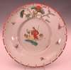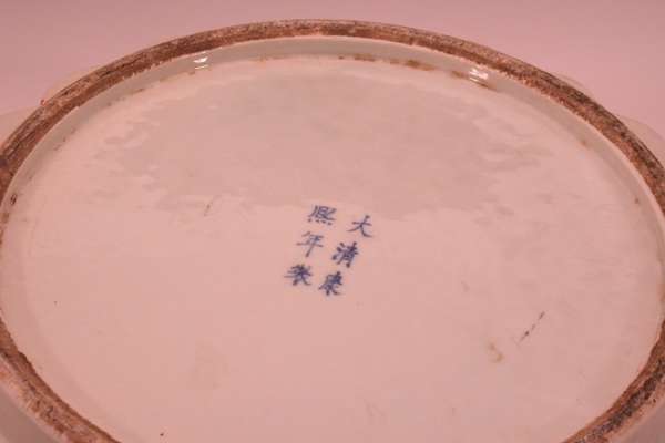 the castellated border with rust painted rim, the deep frieze decorated with butterflies and lilies and the recessed well painted with a figure, the underside painted with continuous frieze of figures, with rust painted protruding lobed collar to foot, blue painted six character mark