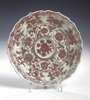 Sold for £38,000 A rare Chinese porcelain circular scalloped underglaze copper red cup stand, Yuan, early Ming dynasty