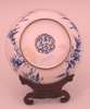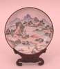 painted with landscape panel of hills and houses beside a river, with mountains in the background, the underside with bamboo sprigs and central scroll roundel with a carved hardwood stand