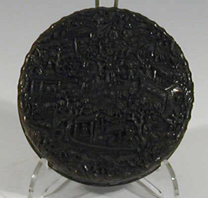 the lid profusely carved with figures, a boat and a bridge amidst pavilions, the sides with pavilions amidst trees, the base with central vacant panel and surrounded by figures, trees and pavilions,