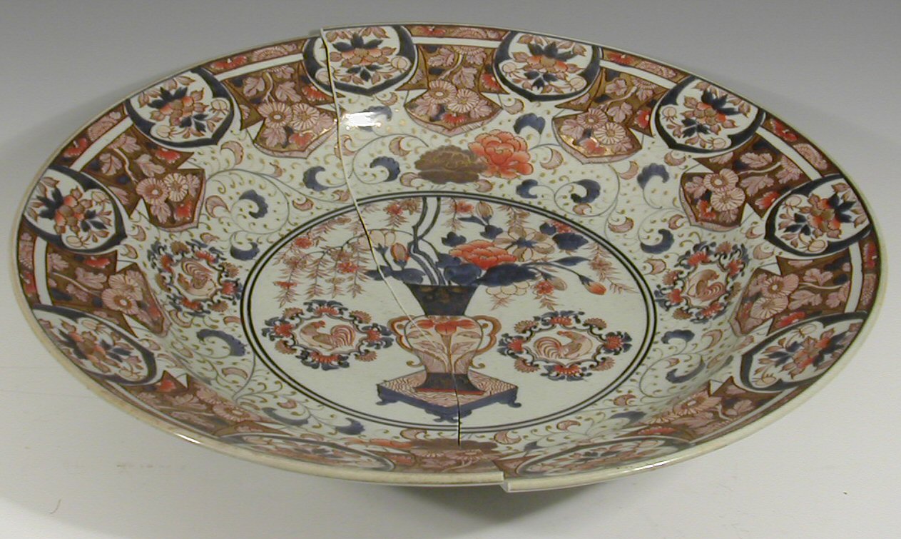 A large 17th century Japanese Imari deep bowl (cracked in two),