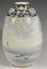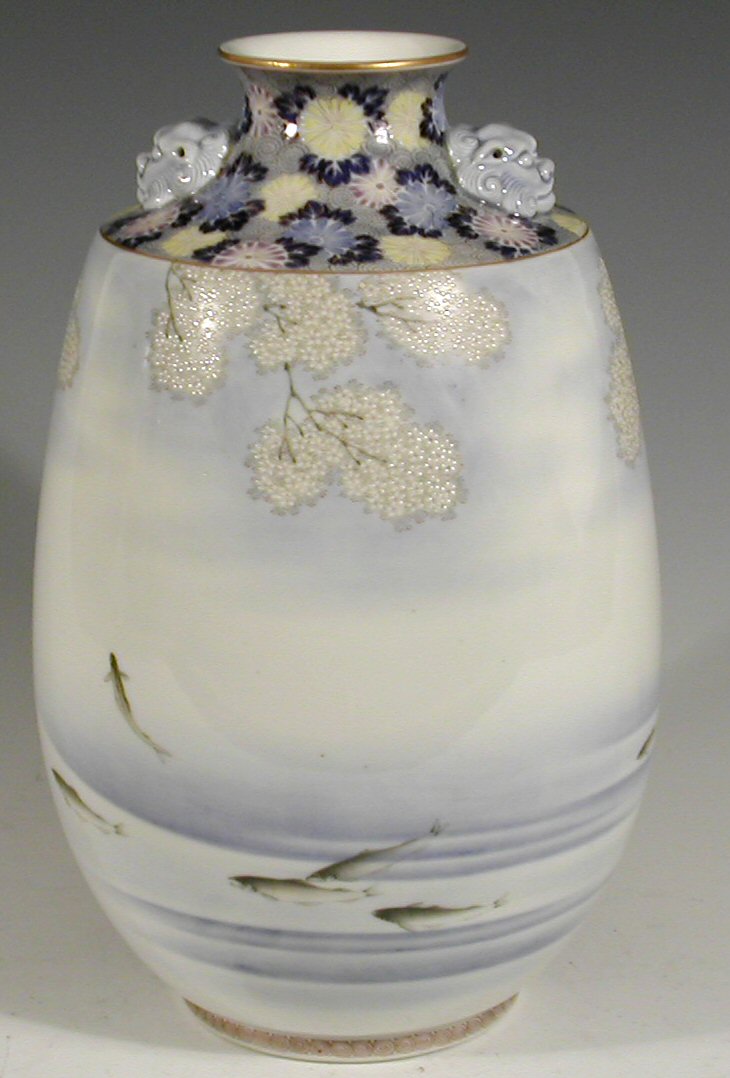 the flared neck with opposed mask handles and crysanthemum flowerheads, the body painted in underglaze blue, yellow, red and gilt, with peony blossom, cherry blossom and swimming carp, the base signed in blue script