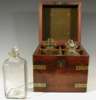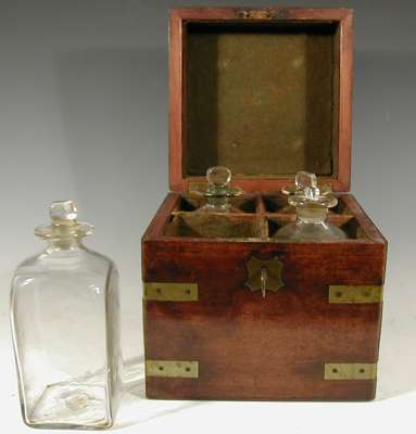 brass bound to the angles, the hinged lid lifting to reveal an interior fitted with four square glass decanters and stoppers, brass carrying handles