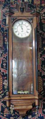 with ebonised decoration, the single train movement with anchor escapement, the white enamelled dial with Roman chapters and subsidiary seconds dial, indistinctly marked J Munro, ***, the case with stepped moulded cornice and turned finials, glazed door and sides