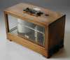 the rectangular box with glazed panel to the front and to one side, opening to reveal recording drum and mechanism and raised on a plinth with sliding drawer
