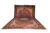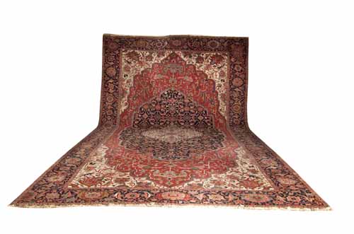the brick red field with large indigo medallion containing smaller sky blue medallion, ivory spandrels, within indigo turtle palmette border between bands