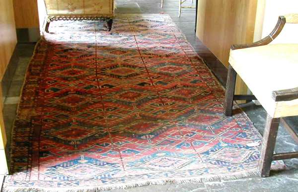 the indigo field with ivory and rust triple medallion pole, striped spandrels, within rust rosette border between bands