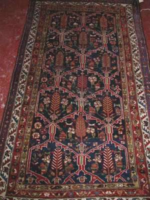 the indigo field with allover red lattice and tree pattern, within various scrolling vine borders