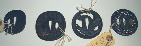 decorated with a butterfly with gold inlaid wings against a basket-weave background, stamped with a collection number, 7.6cm; a circular iron sukashi tsuba, carved and pierced with a pine tree, signed Choshu ju Yasuyuki tsukuru, stamped with a collection number, 7.3cm; a circular iron sukashi tsuba carved and pierced with various insects and grasses, 6.6cm; and a rounded square iron tsuba carved as a rat, gold details