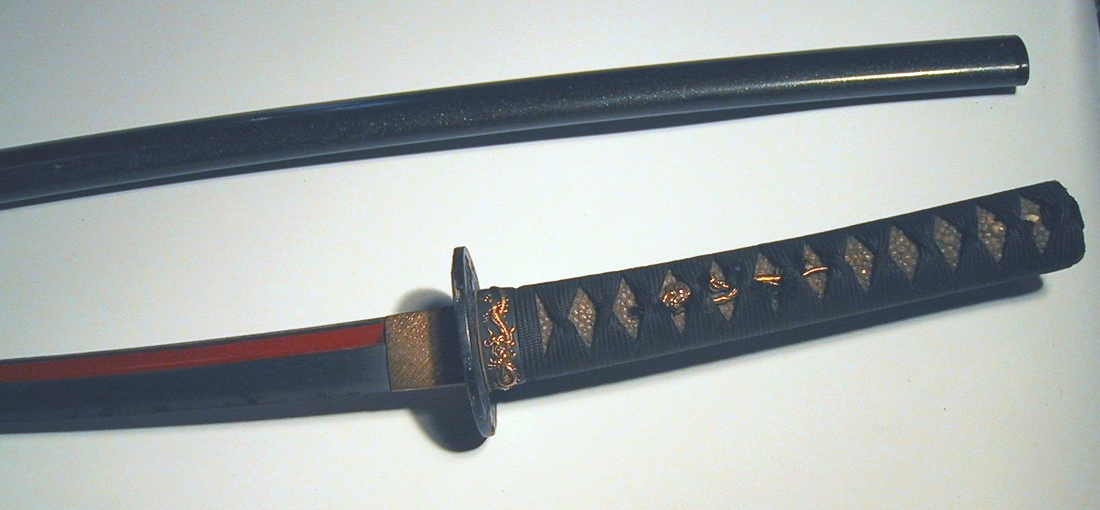 the short point blade with raised top ridge (damaged point and corrosion spots) with full length groove inlaid with red lacquer, unsigned tang with three rivet holes, rayskin grip bound with brown cord incorporating gold menuki in the form of dragons, lower pommel (above tsuba) with raised gold dragon, the bronze hand guard (tsuba) unsigned decorated with Samurai and prunus trees, top pommel lacking, in bronze-spangled lacquer scabbard