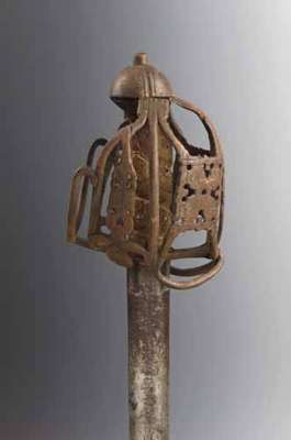 the hilt of conventional form with pierced cross guards some damage to bars, the wormed wooden grip missing its cover and binding, large mushroom shaped pommel, the double edged blade signed ANDRIA FRERARA