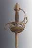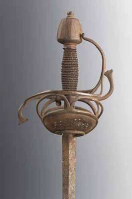 the hilt with pierced inner shell hand guard (one missing) resting on side rings, the quillions turned to the blade and knuckle guard and with fish tail terminals, the arms of the hilt swept to join the side guards in an elegant sweep, the large multi- faceted pommel of ovoid form, the grip bound with a double twist of wire, the double edge tapering blade of diamond section with blade-smiths mark at the ricasso, with an old ivory inventory tag numbered 24 all over light corrosion on hilt and blade