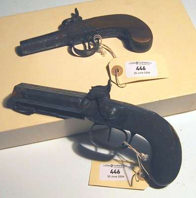 on the top rib of the pentagonal barrels, double triggers captive swivel ram-rod, scroll engraved locks, barrel tang and trigger guard (top missing from right hammer) fine chequered butt with blank silver escutcheon; a plain percussion box lock single turn off barrel pocket pistol with plain slab sided butt (2)