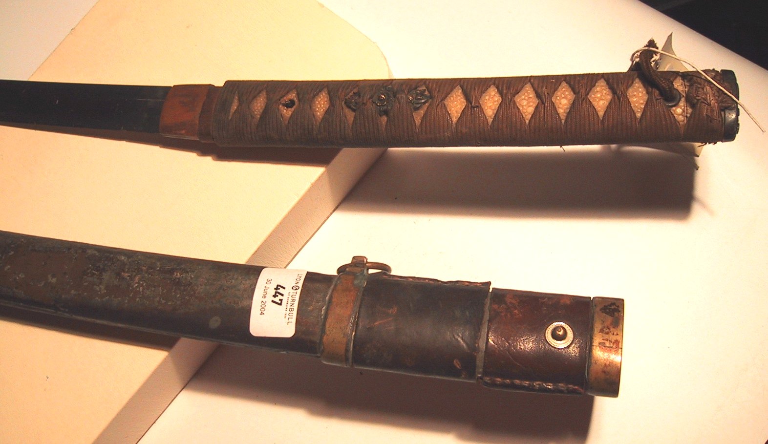 signed tang and three rivet holes, the grip covered in white ray skin and bound with brown cord incorporating floral menuki on each side and bound into the pommel, the tsuba lacking, in wooden scabbard with leather throat and brass chape