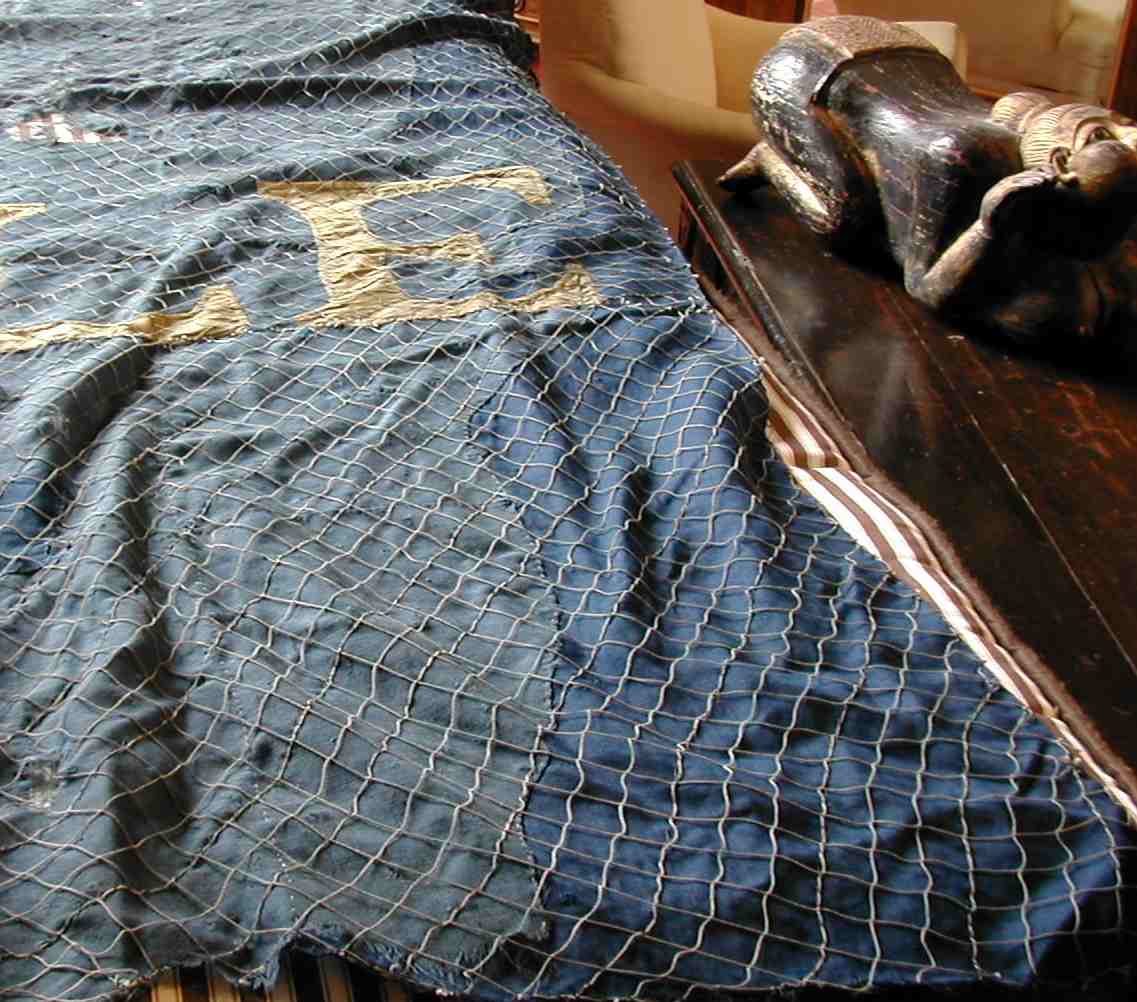 a Royal Navy ensign of navy blue bunting with a Union Flag in a canton; sewn to the ensign, in yellow bunting letters 12 ½" (32cm) high, the title IMPREGNABLE