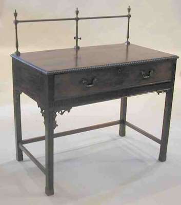 the rectangular crossbanded top with brass rail and gadrooned edge above single secretaire drawer opening to reveal an interior fitted with drawers and pigeonholes, above square fluted supports with decorative pierced brackets