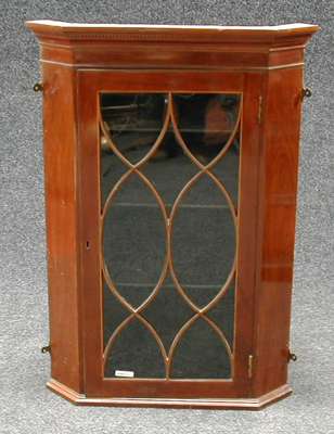 with canted sides, the dentilled cornice above glazed door with boxwood laminated curvilinear astragals enclosing shelves