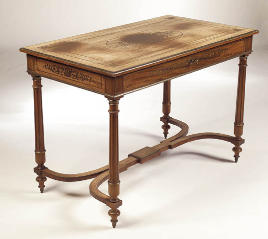 the rectangular top centred by brass inlaid urn of flowers in a scrolling canopied cartouche, single frieze drawer and turned and fluted legs joined by shaped stretcher with central tablet, toupie feet