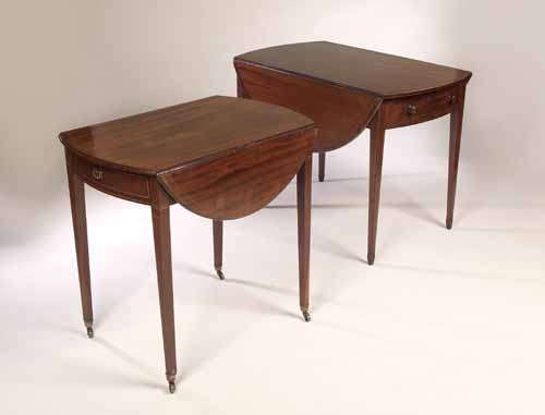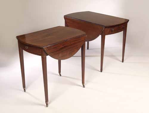 with boxwood and ebony stringing, the oval top with moulded edge above corresponding bowed frieze drawer and opposing dummy, on square section tapered legs with brass caps and castors