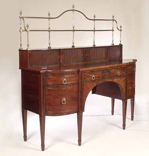 with brass stringing, the breakfront stage with tambour doors and rosewood panels surmounted by brass gallery with turned and blocked uprights and urn finials, the breakfront top with quadrant flanks above single central frieze drawer with arched kneehole below flanked by drawer and cupboard or deep drawer to each side on square section tapering legs with spade feet
