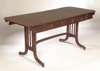 with ebony inlay, the rectangular top with rounded angles and reeded edge above opposing frieze and dummy drawer on balustraded trestle supports with splayed feet with cast paw caps and castors, joined by arched stretcher