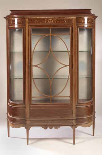 with boxwood stringing, the ledgeback above semi-bowed top and husk swag inlaid frieze, over a central astragal glazed door, enclosed by bowed glass panels and enclosing glass shelves, the whole raised on square tapered legs