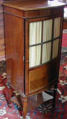with boxwood and chequer stringing and with kingwood crossbanding, the ledge base above astragal glazed door with panel below, the whole raised on square tapered legs linked by a lower tier
