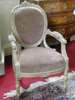 in the Louis XVI manner, each with oval upholstered panel backs with ribbon-carved moulded frames with foliate crestings, the open arms and upholstered seats raised on turned and fluted front legs (2)